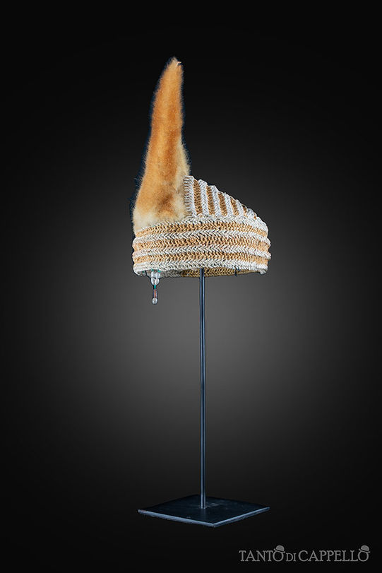 Copricapo di guerriero dell'etnia Asmat raccolto nel villaggio di Omandesep, sulla costa occidentale dell'isola della Nuova Guinea, nella regione indonesiana ora chiamata West Papua (ex-Irian Jaya). Gli Asmat, noti per gli stupendi scudi scolpiti, erano tagliatori di teste e cannibali, pratiche che si dice abbiano completamente abbandonato solo durante gli anni '90. Sono ritenuti coloro che probabilmente uccisero e mangiarono Michael Rockefeller nel 1961.
