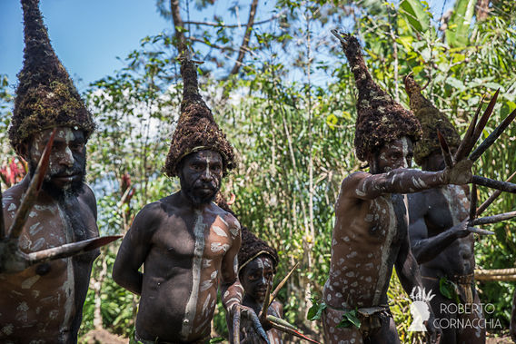 Copricapo utilizzato per la danza del "Mezzo uomo Nokondi", una figura mitica delle Highlands Orientali della Papua Nuova Guinea, mezzo uomo e mezzo fantasma. I danzatori hanno metà del corpo dipinta con segni bianchi su uno sfondo rossastro e il resto del corpo non dipinto. Nella mano della parte dipinta portano dei bambù sulle dita che le fanno sembrare degli artigli, mentre la mano della parte non dipinta viene più che altro tenuta dietro la schiena. Si muovono lentamente e a scatti.
